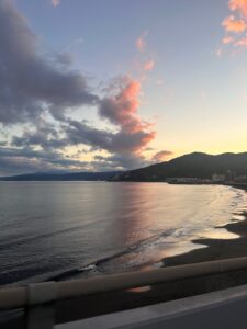 海沿いを夕焼けを見つつ車を走らせ目的地到着